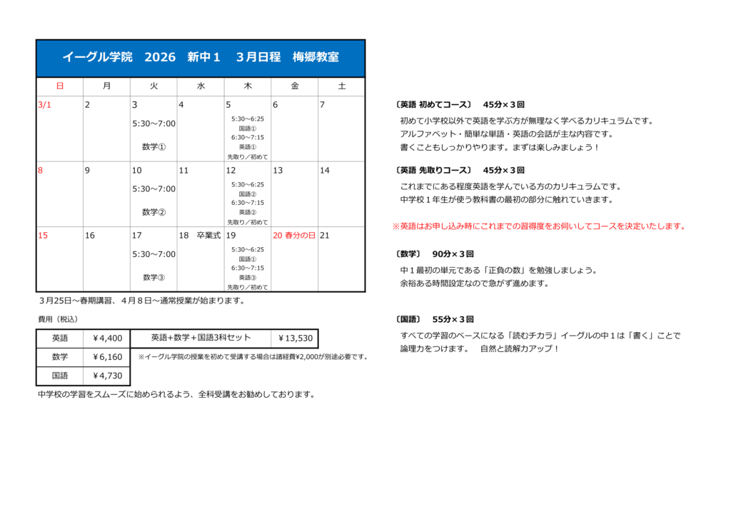 新中1準備講座のご案内